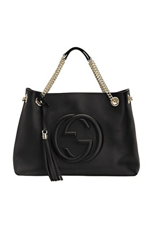 Gucci’nin trapez formundaki çantaları, markanın logosunun kabartmalı siluetiyle kadın stilinde güçlü ve çekici bir izlenim bırakır. Orta uzunlukta zincir saplar ve sapın tabanına tutturulmuş deri püsküllerle donatılmışlardır. Bu tür aksesuarlar, sert bir çerçeveye sahip olup birçok kombinle mükemmel uyum sağlar.
