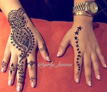 Mehndi tekniğiyle yapılan desenler, standart dövmelere mükemmel bir alternatiftir. Bu tür bir görüntü, ciltte bir haftadan bir aya kadar kalır.