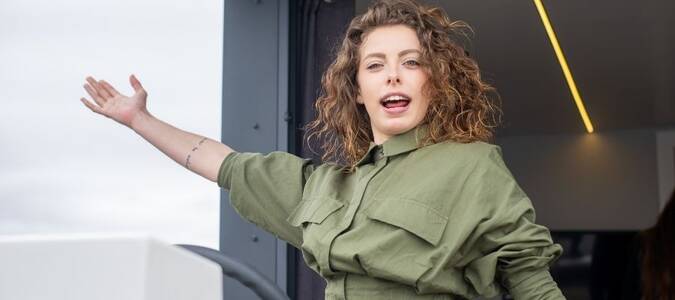 Yaratıcı tasarıma sahip yüksek topuklu yeşil ayakkabılar, çiçek desenli bir elbise ve kot ceketle mükemmel bir uyum sağlar. Görünüm, küçük bir yeşil çanta ile tamamlanır.