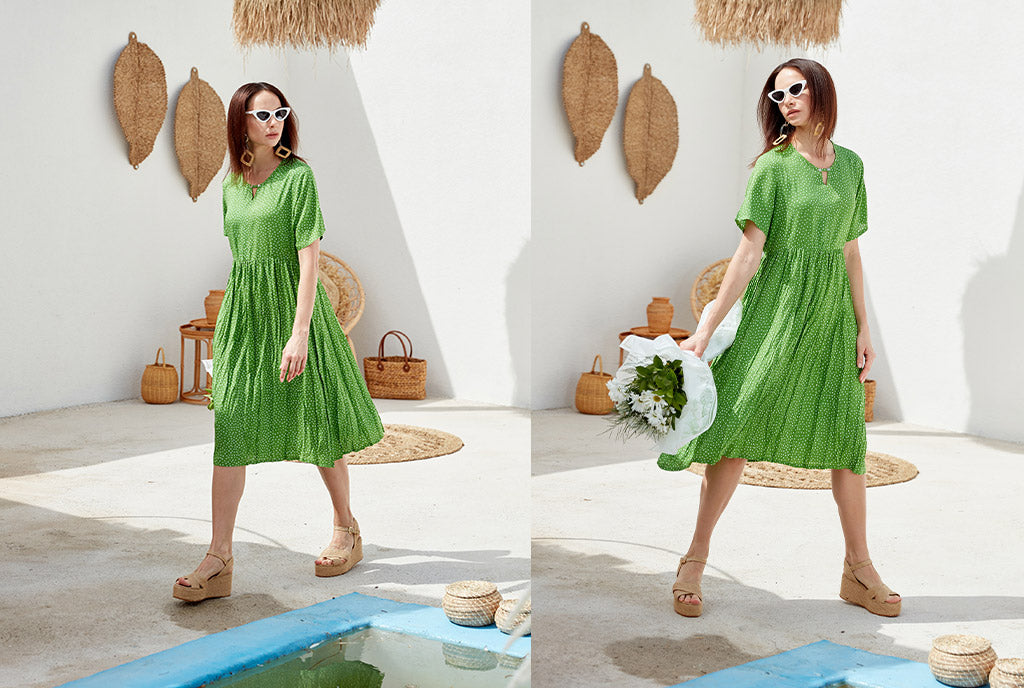 Beyaz ve soluk yeşil tonlarının bir araya geldiği hafif ve feminen bir elbise, zarif ve etkileyici bir stil yaratır.