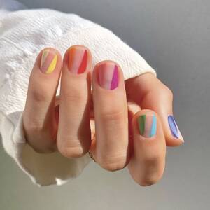 Kısa tırnaklarda çok cazip olan tek renkli desen, birçok çizgiden ve kısa işaretlerden oluşur. Ayrıca, arka plan için açık renkli bir oje kullanmanız gerekmiyor – şeffaf ya da inci parlaklığında bir oje de işinizi görecektir.