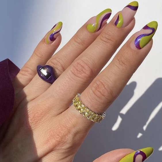 Sarı ve mor tonlarına sahip bir manikür hem günlük hem de gece kullanımına uygun olabilir. Bu, seçilecek tonun yoğunluğuna bağlıdır çünkü bu renk paleti oldukça geniştir.