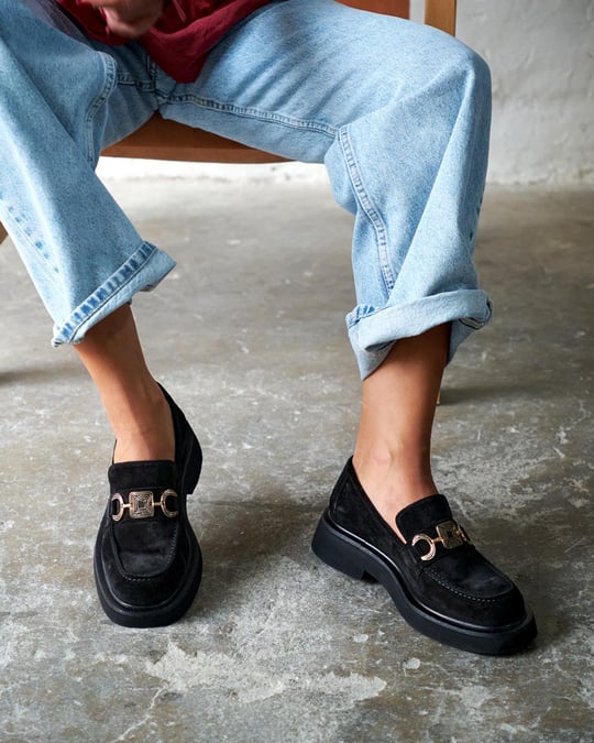 Soğuk bir sonbahar gününde siyah mokasenler, sıcak bir örgü kazak ve klasik kesim kot pantolon ya da balıkçı yaka bir kazakla mükemmel bir uyum sağlar.