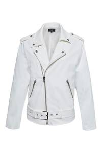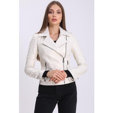Beyaz deri ceket, her renk kıyafetle uyum sağlayan evrensel bir gardırop parçasıdır.