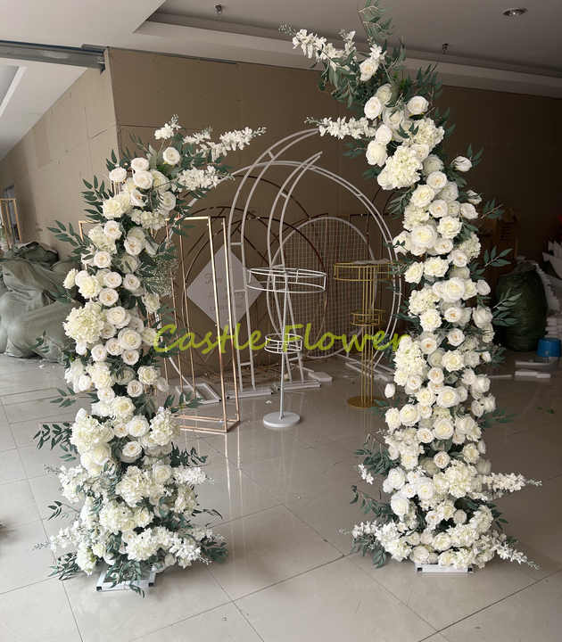 Çiçeklerle süslenmiş bir düğün arkası, kutlamaya özel bir zarafet ve çekicilik katacaktır. Bu durumda, çerçeve tamamen çiçeklerle çevrileceği için, şekli herhangi bir biçimde olabilir. İlk olarak, yapının çerçevesi kumaşla, örneğin tül ile örtülür. Ardından, yapay çiçeklerden bir çelenk yapılır, bu çelenk dikkatlice kumaşın etrafına sarılır ve inşaat zımbası ya da sıcak yapıştırıcı ile sabitlenir. Çiçeklerin çelenkte daha sık yerleştirilmesi, sonucun daha hacimli ve etkileyici görünmesini sağlar. Çiçekli arka, renk açısından kutlamanın genel renk paletiyle uyumlu olmalıdır.