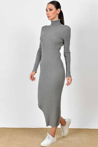 Ofis için gri elbise-yüksek yaka. Vücuda oturan midi boy elbise. Ekstra detaylar – ortada dikiş ve yırtmaç. Siyah opak çoraplar ve siyah çanta ile kombinleyin. Şıklık ve uygunluk.
