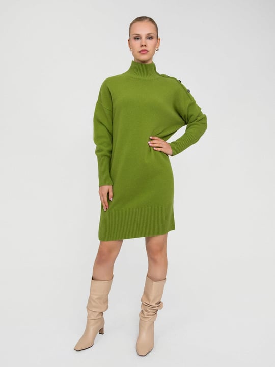 Zeytin yeşili elbise-yüksek yaka. Diz hizasında bir elbise ve yüksek çizmeler. Ek olarak uzun zincirli bir kolye. Bu tür bir elbiseyle randevuya ya da yürüyüşe çıkabilirsiniz.