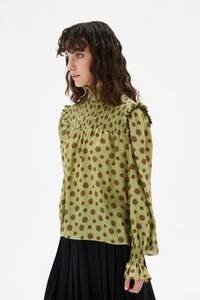 Siyah renkteki “polka dot” baskılı bluz, beyaz renkte harika görünür. Bu bluzu yeşil pantolonlarla ve fiyonklu bej ayakkabılarla kombinleyebilirsiniz. Aksesuar olarak metalik bilezikler veya saatler tercih edilebilir.