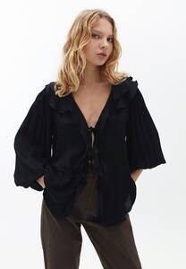 Siyah bluzlar genellikle ön kısmında zarif bir fiyonkla süslenir. Bu model, okul veya iş için mükemmeldir. Romantik gardırop parçalarıyla şık bir şekilde kombinlenebilir. Fiyonk beyaz veya kırmızı renkte olabilir, bu da modele özgünlük ve yaratıcılık katacaktır.