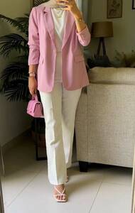 Dar kesim pembe ceket, bele vurguyu etkili bir şekilde yapar. Özellikle belin belirgin olmadığı kadınlar için idealdir. Uzunluk ve renk seçenekleri, kombini tamamlar ve görünümü bütünler.