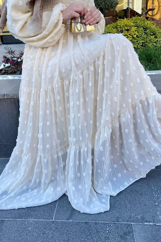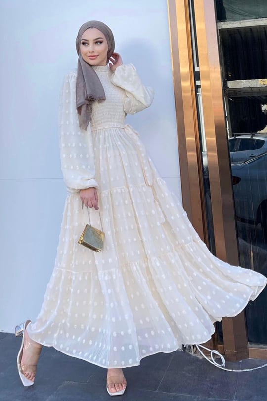 Bej bezelye desenli elbise, her duruma uygun klasik bir görünüm sunar. Ancak yalnızca bir elbise yeterli değildir, mükemmel bir görünüm için ayakkabı ve aksesuar seçimi de önemlidir.