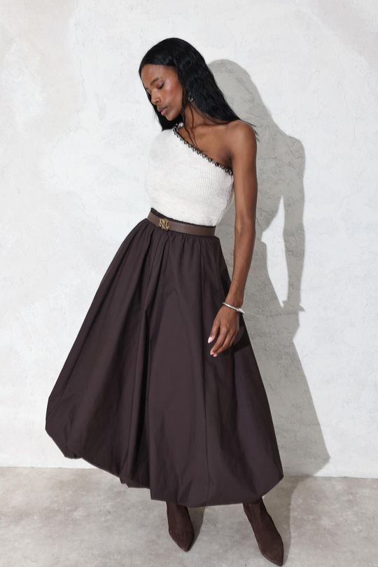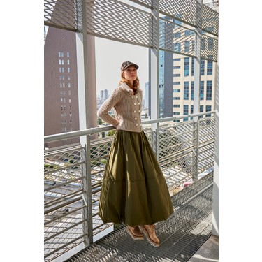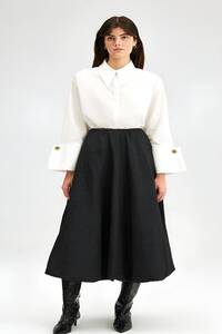 Geniş kesim sevenler, zarif ve sıradışı balon etek modeline dikkat etmelidir. Bu etek, her modelinde vazo formunu hayata geçirmeye çalışan Pierre Cardin’in bir tasarımıdır.