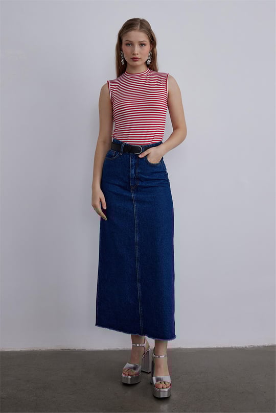 Bel hattı yükseltilmiş denim etek modelleri şu sıralar oldukça popülerdir. Bu tasarımlar, özellikle ideal oranlara sahip kadınlar tarafından tercih edilir çünkü vücut hatlarını etkileyici bir şekilde vurgular.
