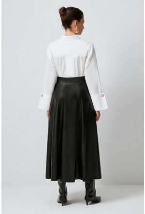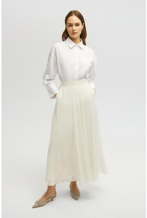 Bu etek, bir kıyafetin ana öğesi olduğundan, sade bir üst ile uyumlu bir şekilde kullanılabilir.