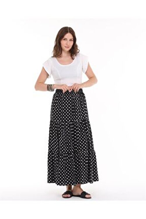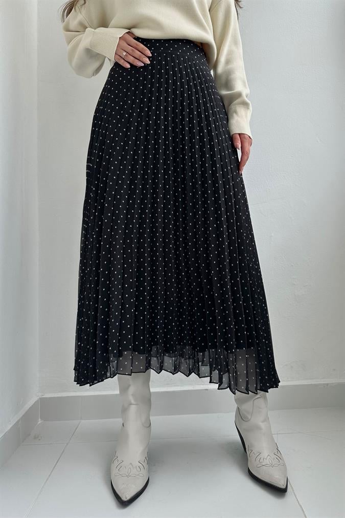 Siyah-beyaz kombinasyonu her zaman büyük popülerlik kazanır ve farklı stillerde şık görünümler oluşturmak için uygundur. Siyah puantiyeli etek, ciddi bir görünüme sahiptir, bu yüzden iş kıyafetleri veya klasik bir stil için mükemmeldir. Sadece ofiste değil, aynı zamanda resmi etkinliklerde de giyilebilir.