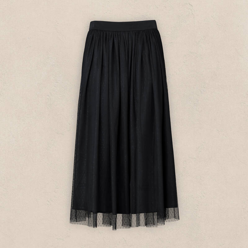 Uzun siyah eteğe pliseli model, hacim kazandırarak zarif ve şık bir görünüm sağlar. Ancak, üst giyim seçerken dengeyi korumaya dikkat edin: hacimli bir eteğe, yine hacimli bir üst giymekten kaçının. Aksi takdirde, görünümünüz abartılı ve grotesk olabilir.