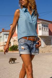 Daha klasik bir görünüm, ancak tanıtılması gereken bir kombin: kot pantolon ve kolsuz kot gömlek. Burada dikkat edilmesi gereken, tonların farklı olması ve pantolonun daha kalın bir kumaştan yapılmış olmasıdır.