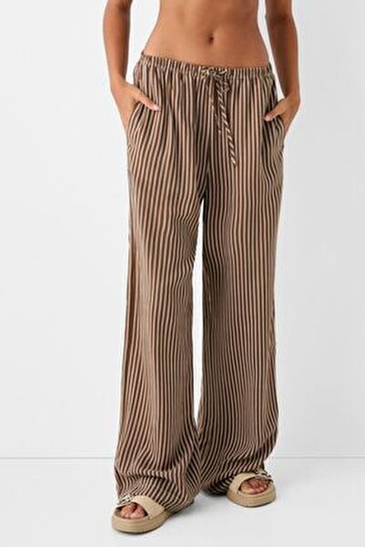 Rahat ve şık bir görünüm için bol kesim pantolonlar. Geniş ve ince çizgilerin kombinlendiği bir örnek. Ürün, sakin tonlarda tasarlanmış. Üst olarak omuzları açıkta bırakan bol kesim bir bluz ekliyoruz.