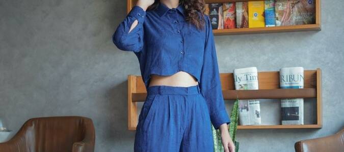 Bunun tersi de geçerli olabilir; düz renk pantolonlarla aynı tonlarda desenli, klasik bir gömlek. Örneğin, koyu mavi pantolon ve klasik bir modelde, nazik bir çiçek deseni (örneğin, hafif mavi çiçek desenleri) içeren bir bluz. Desenlerin tonu alt kıyafetle uyumlu olmalıdır.