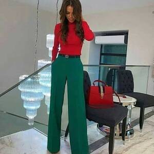 Açık pembe fırfırlı hafif bir bluz ile canlı yeşil renkte düz kesim pantolonun kombinasyonu inanılmaz güzel görünür. Böyle bir kıyafet yaz veya bahar aylarında harika bir tercih olacaktır.