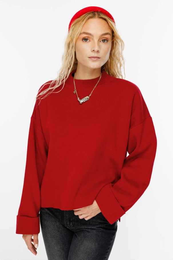 Kalın örgü, kırmızı kazak, krem rengi bluzun üzerine giyildiğinde şık ve zarif bir görüntü oluşturur. Kısa kollar, kazak altındaki şık bluzun görünmesini sağlar. Bu üst, klasik kesim hardal rengi pantolonlarla harika bir uyum yakalar.